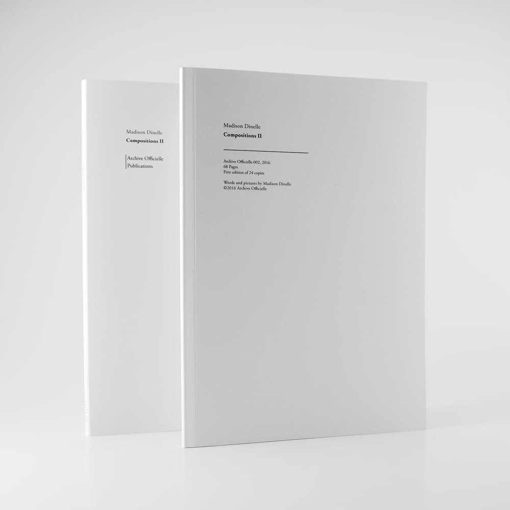 This book contains Compositions II, a series of images made by photographer Madison Dinelle. The artist explores compositional possibilities by cropping photographs from her own family albums. By extracting these portions of images, the initial context is blurred and new formal interactions lead the viewer into a world which is at once foreign and familiar.